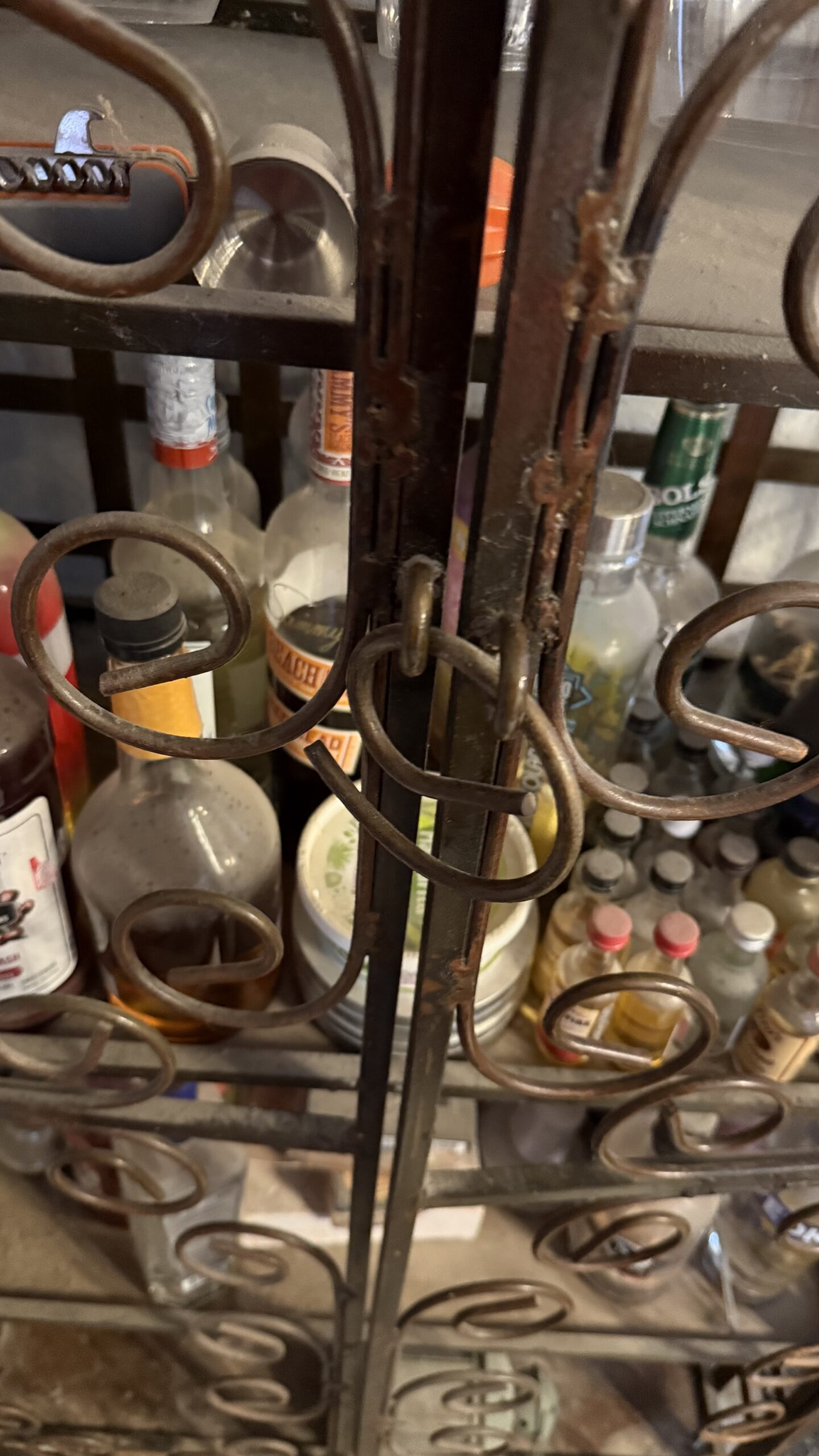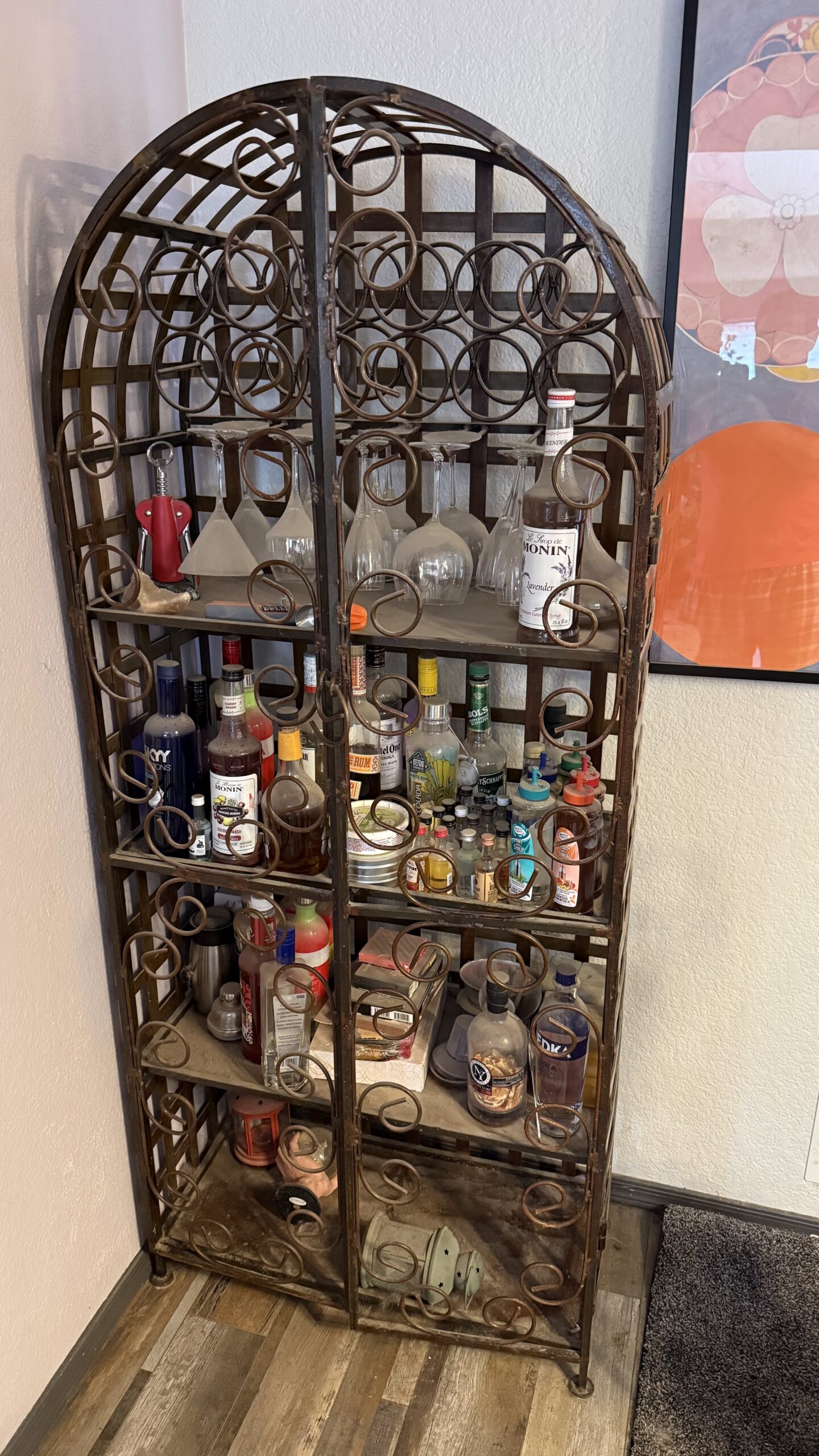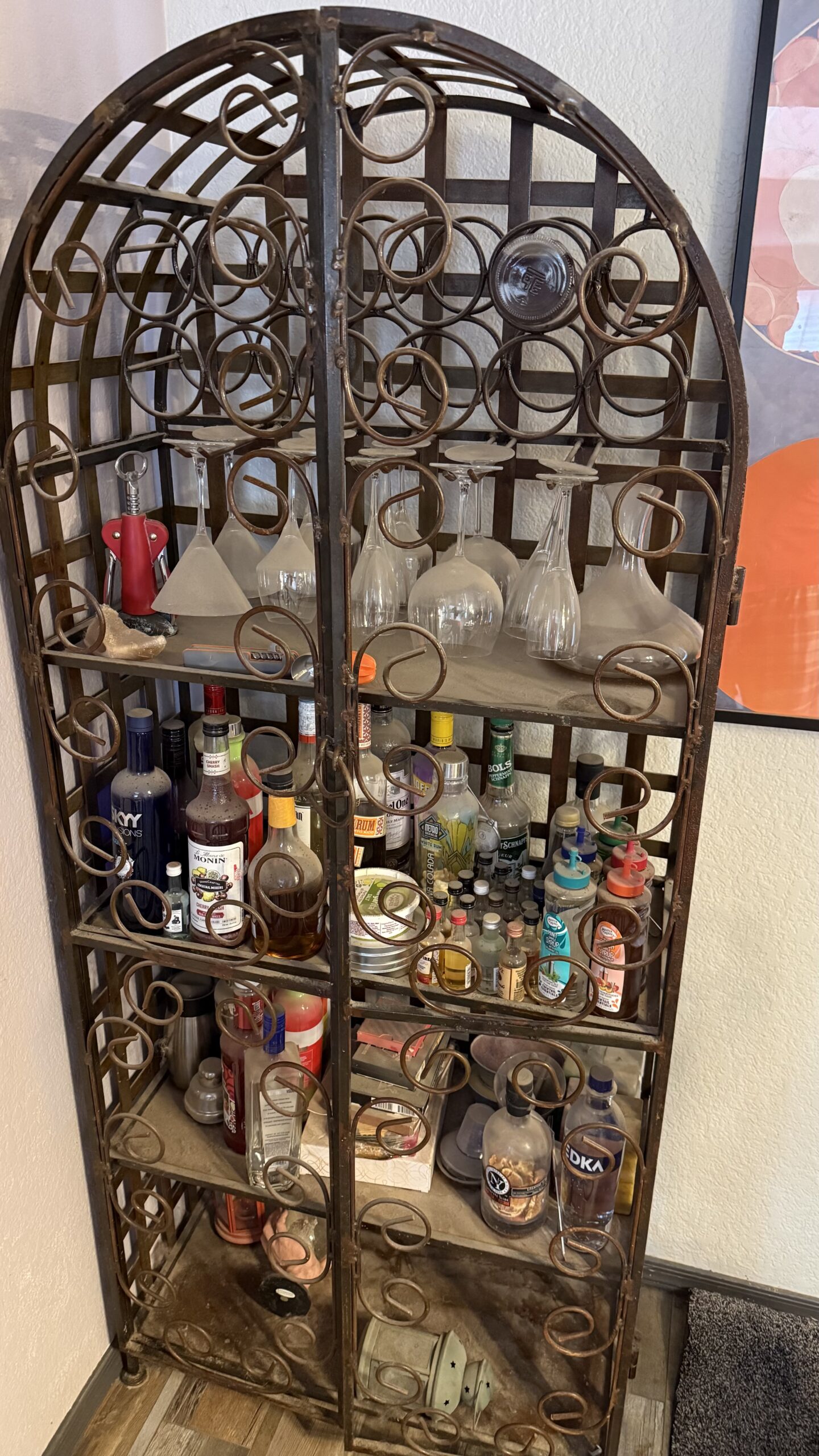 This item is HEAVY! It appears to be made of Brass or Copper, but not 100% sure. There’s space for 12 bottles of wine up top plus 3 shelves and glass storage.