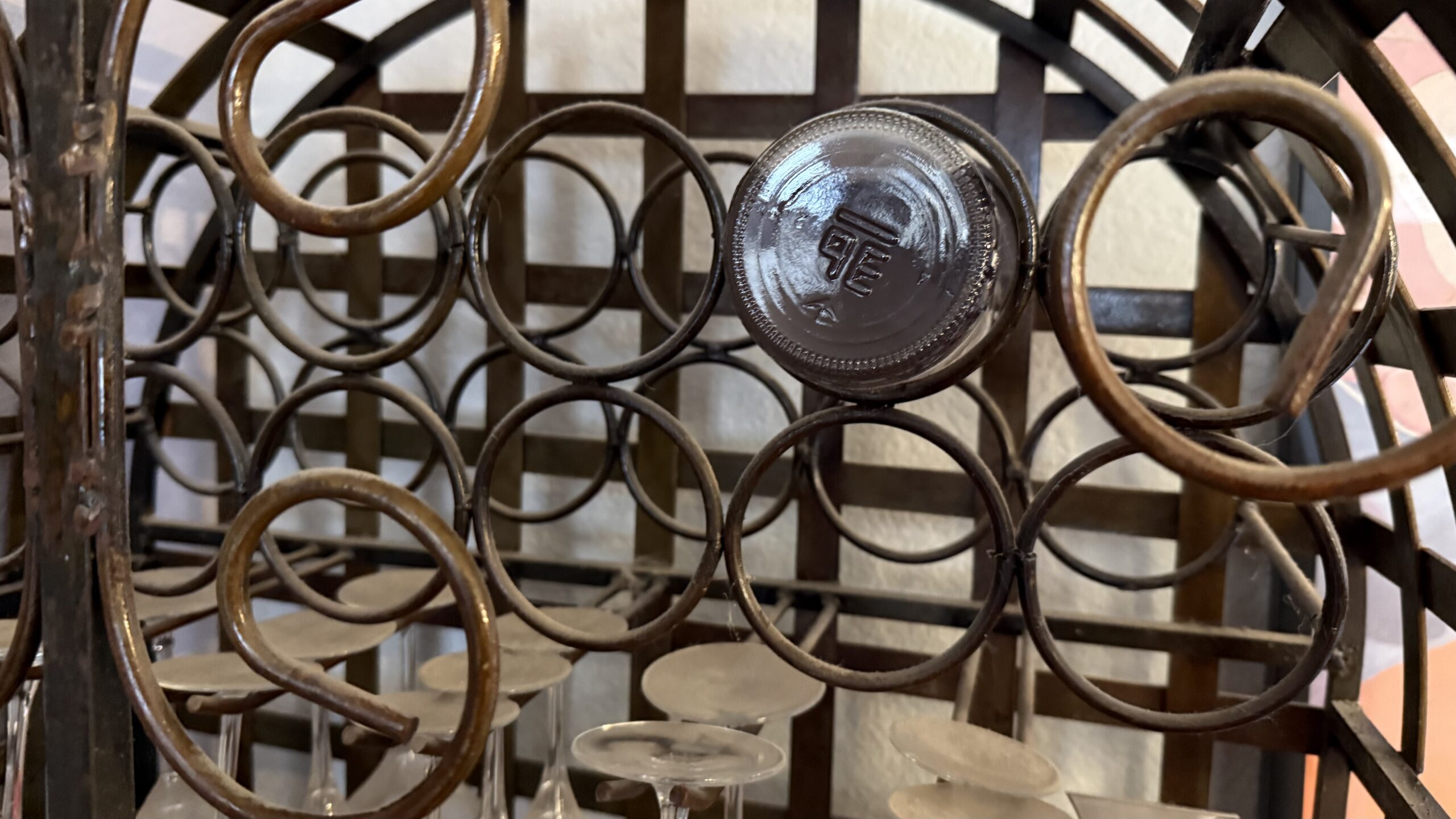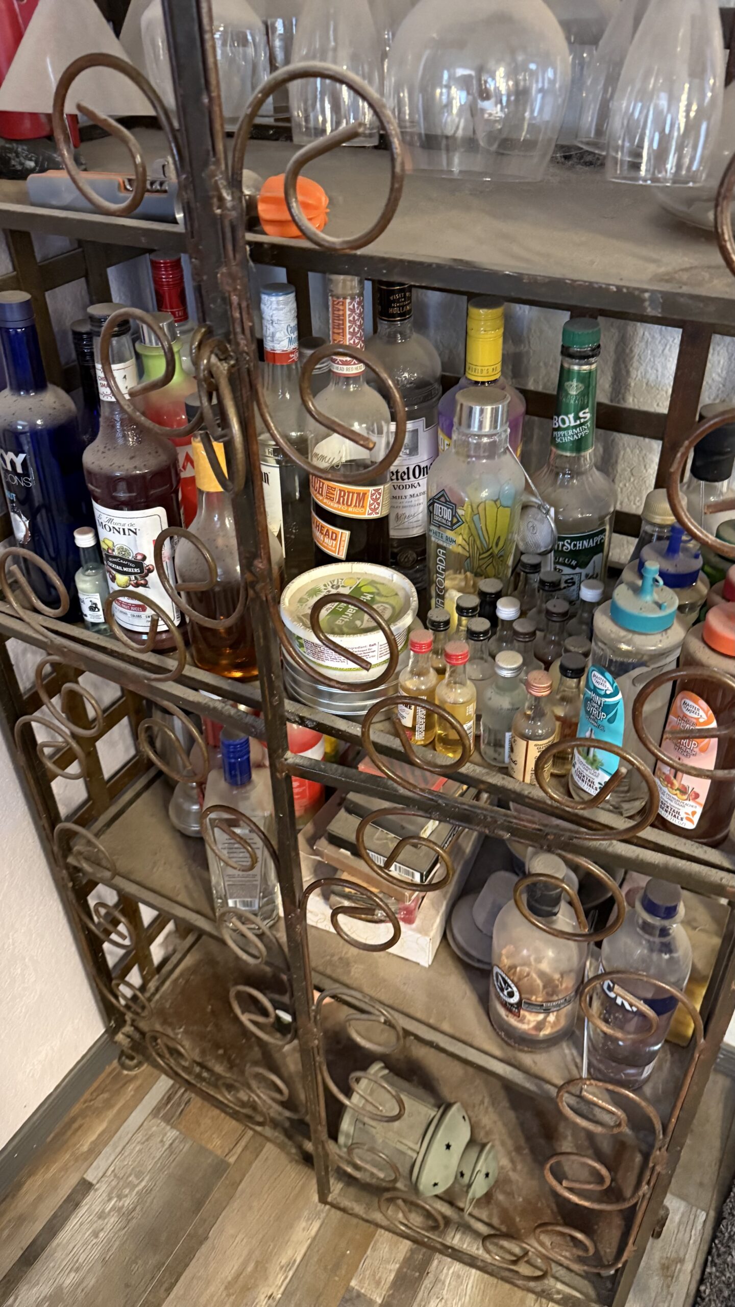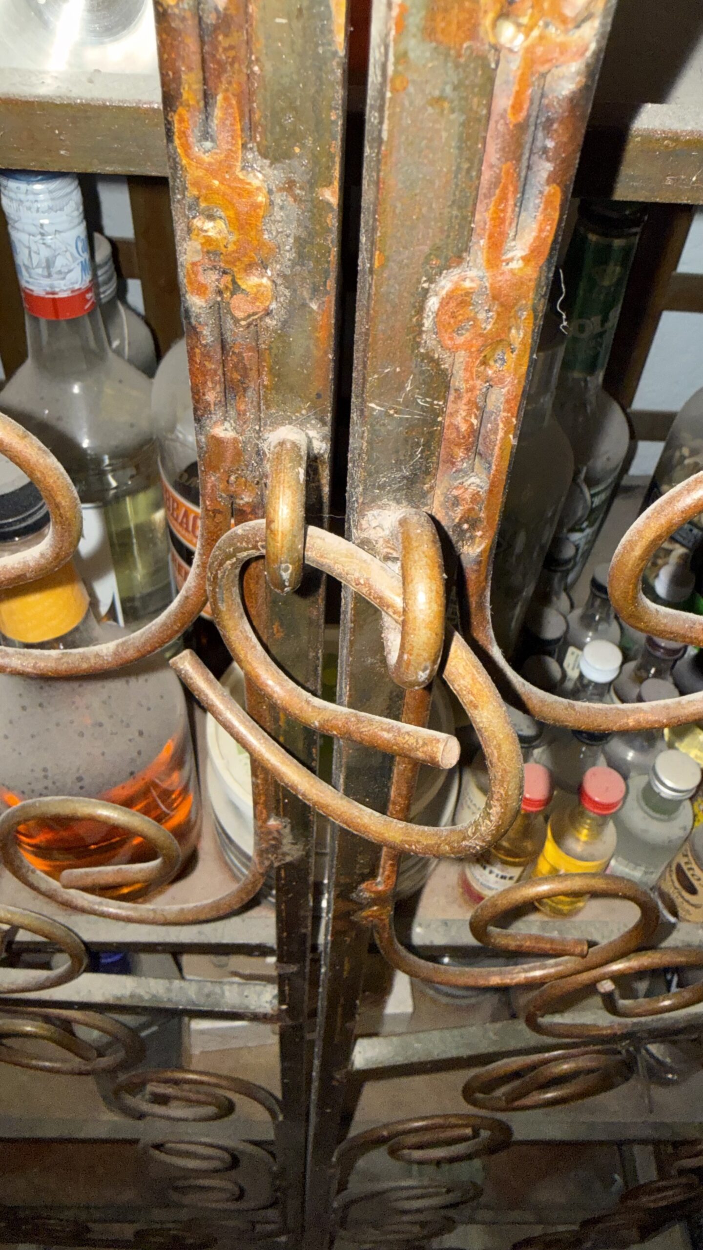 This item is HEAVY! It appears to be made of Brass or Copper, but not 100% sure. There’s space for 12 bottles of wine up top plus 3 shelves and glass storage.